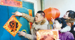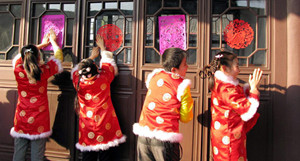 贴春联的习俗,大约始于一千多年前的后蜀时期,是有史为证的。春联也叫门对、春贴、对联、对子、桃符等,它以工整、对偶、简洁、精巧的文字描绘时代背景,抒发美好愿望,是中国特有的文学形式。每逢春节,无论城市还是农村,家家户户都要精选一幅大红春联贴于门上,为节日增加喜庆气氛。春联的种类比较多,依其使用场所,可分为门心、框对、横披、春条、斗方等。“门心”贴于门板上端中心部位;“框对”贴于左右两个门框上;“横披”贴于门媚的横木上。